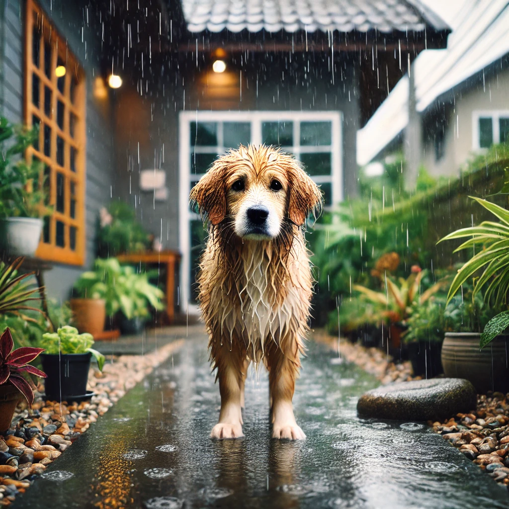 wet /wɛt/ 湿的;dog /dɔɡ/ 狗;rain /reɪn/ 下雨;is raining /ɪz ˈreɪnɪŋ/ 正在下雨;outside /ˌaʊtˈsaɪd/ 外面