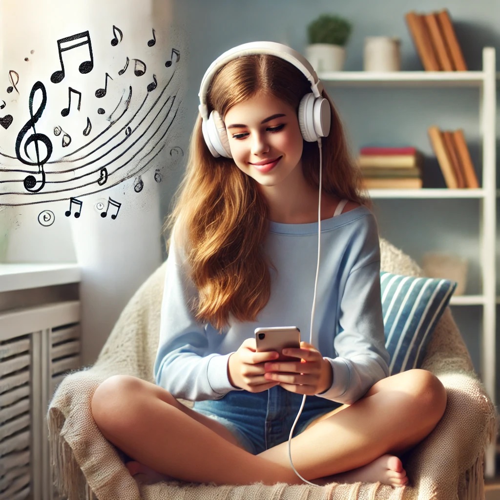 她正在听音乐。