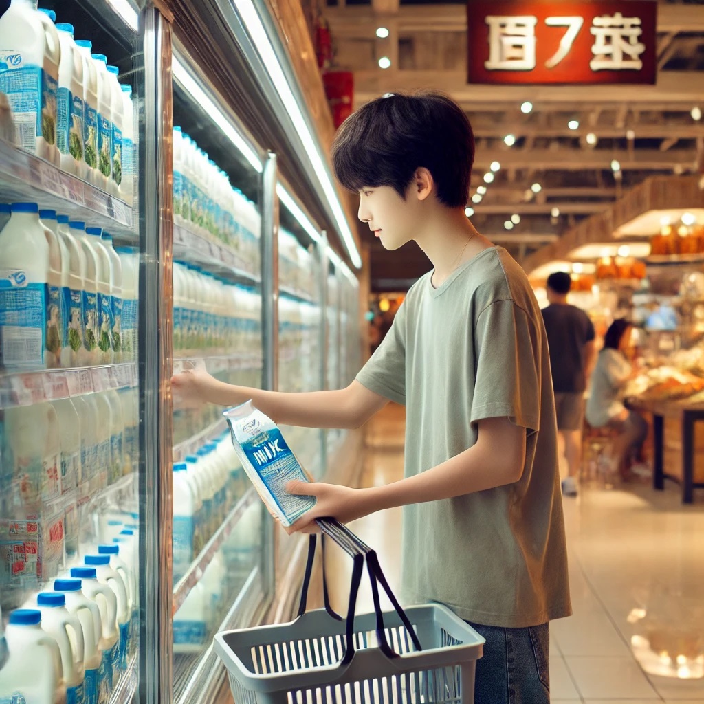 我在超市买牛奶。