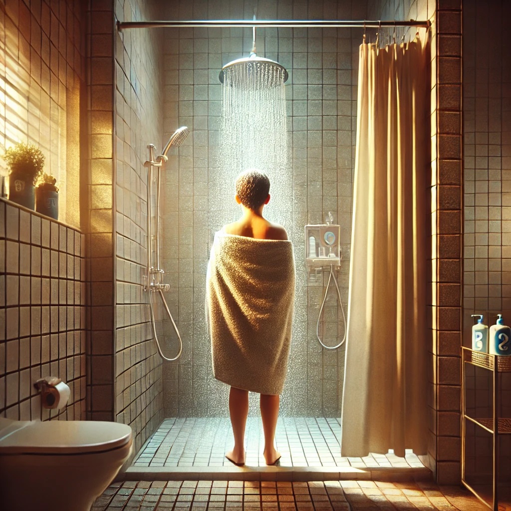 I take a shower in the bathroom. /aɪ teɪk ə ˈʃaʊər ɪn ðə ˈbæθrum/