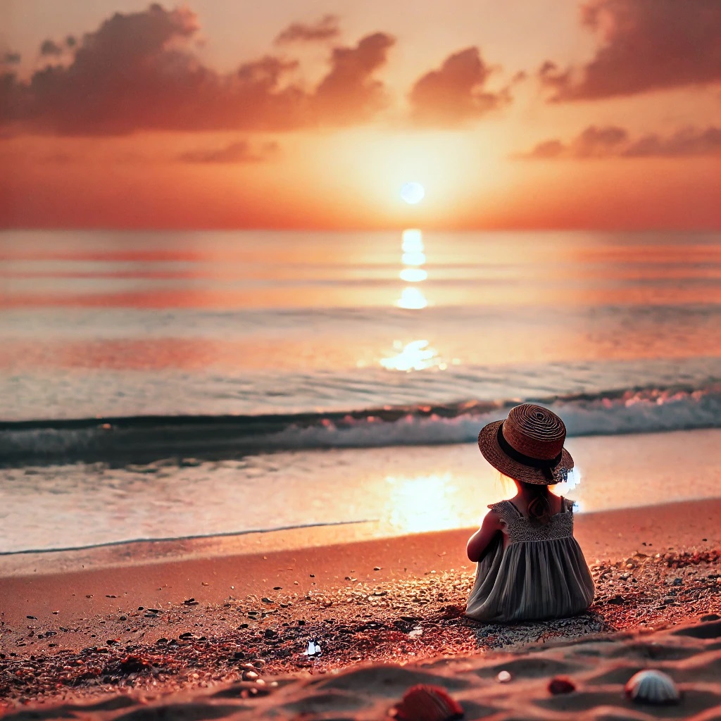 我在沙滩上看日出。