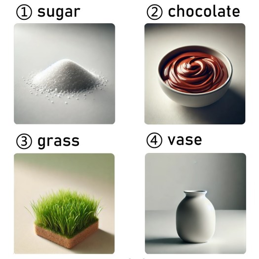 ① sugar /ˈʃʊɡər/ 糖;② chocolate /ˈtʃɑklət/ 巧克力;③ grass /ɡræs/ 草;④ a vase /ə veɪs/ 花瓶
