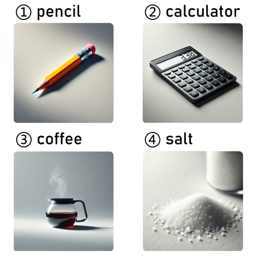 ① a pencil /ə ˈpensl/ 铅笔;② a calculator /ə ˈkælkjəˌleɪtər/ 计算器;③ coffee /ˈkɔfi/ 咖啡;④ salt /sɔlt/ 盐