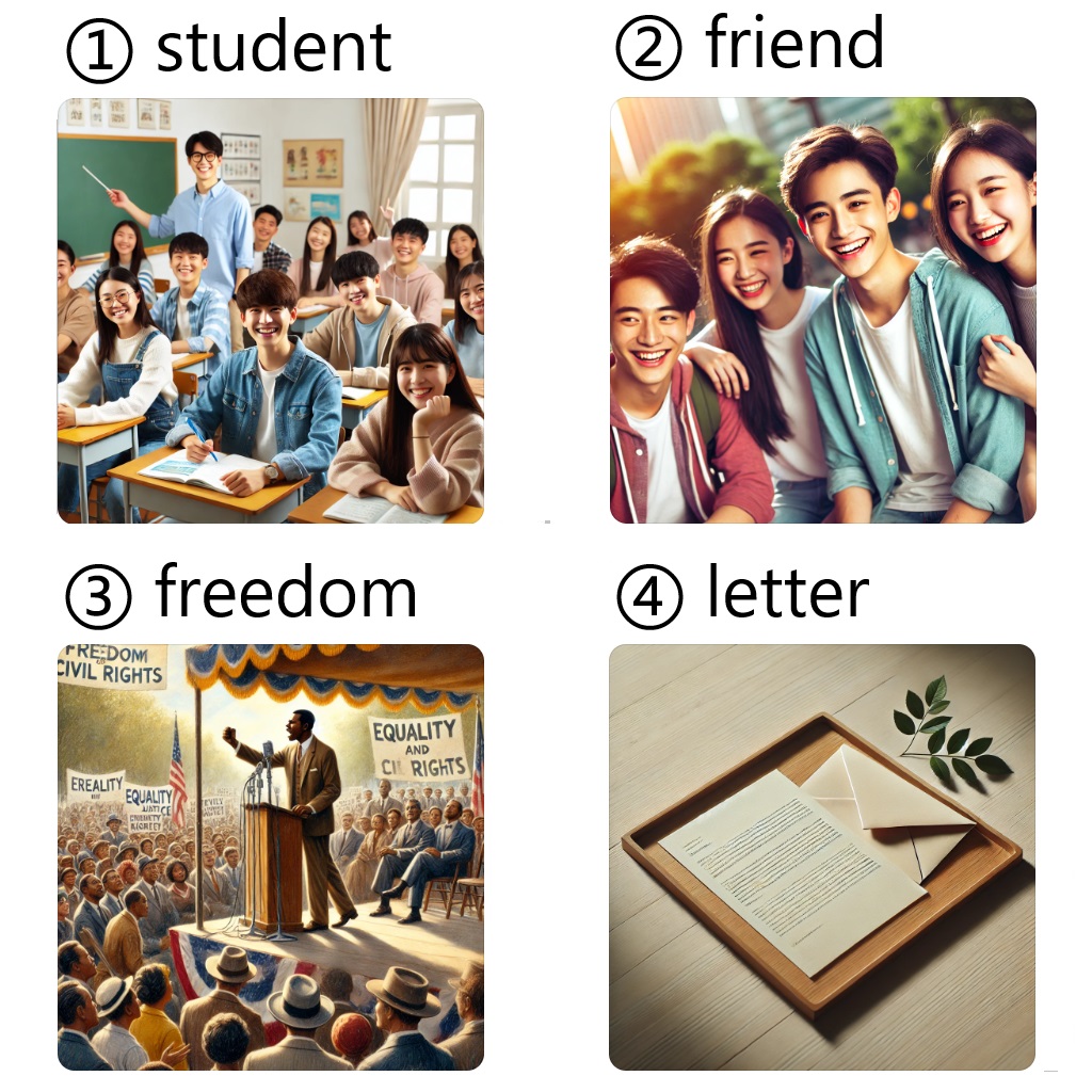 ① students /ˈstudənts/ 学生;② friends /frɛndz/ 朋友;③ freedom /ˈfridəm/ 自由;④ a letter /ə ˈlɛtər/ 信