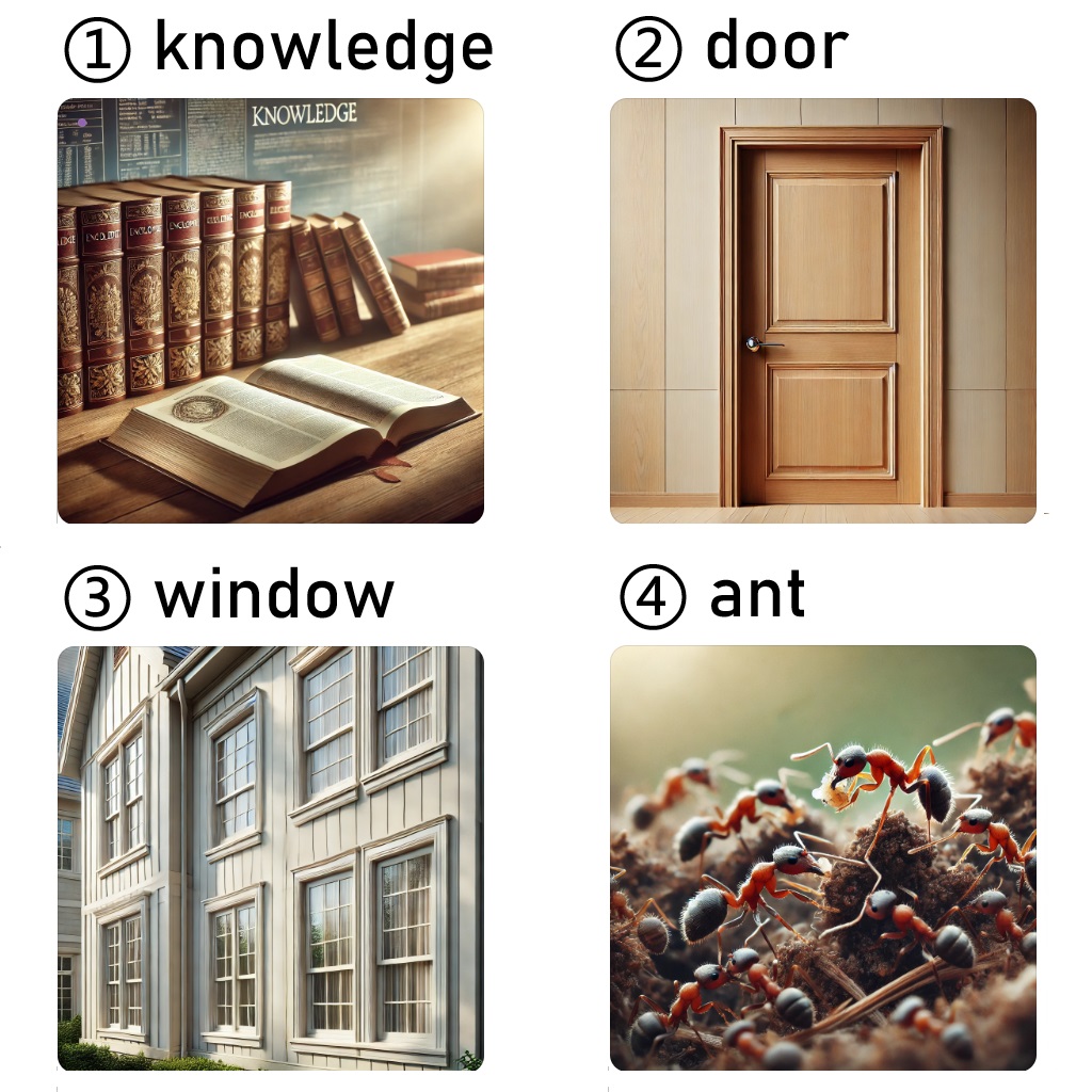 ① knowledge /ˈnɑlɪdʒ/ 知识;② a door /ə dɔr/ 门;③ windows /ˈwɪndoʊz/ 窗户;④ ants /ænts/ 蚂蚁