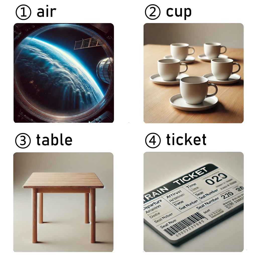 ① air /ɛr/ 空气;② cups /kʌps/ 杯子;③ a table /ə ˈteɪbəl/ 桌子;④ a ticket /ə ˈtɪkɪt/ 票