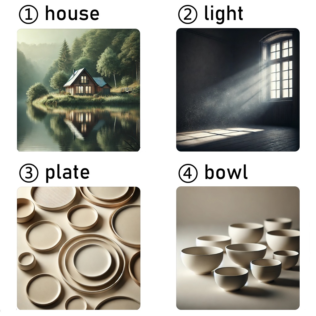 ① a house /ə haʊs/ 房子;② light /laɪt/ 光;③ plates /pleɪts/ 盘子;④ bowls /boʊlz/ 碗