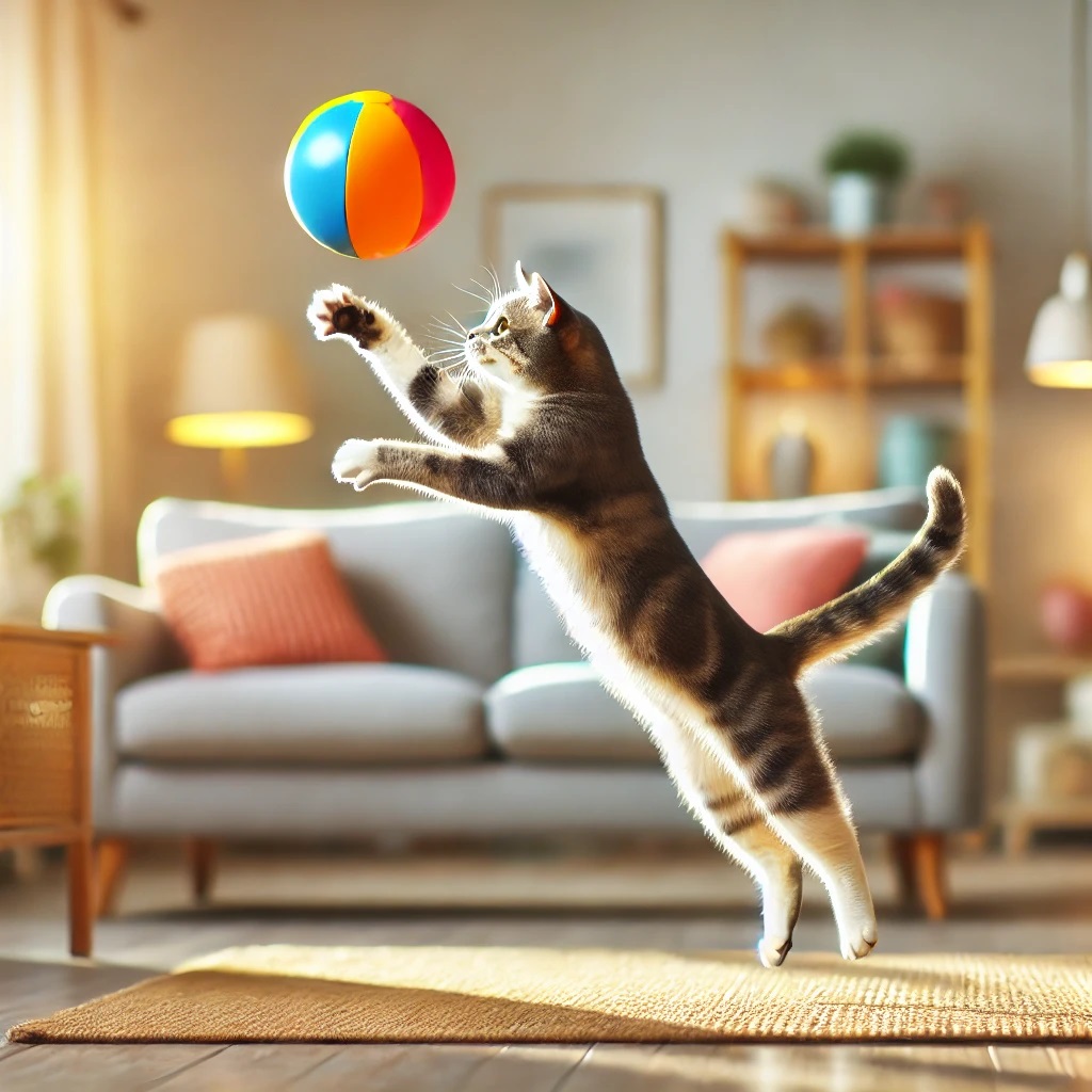It is playing with a ball. / It’s playing with a ball.(ɪt ɪz / ɪts ˈpleɪɪŋ wɪð ə bɔl)