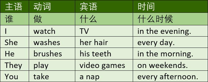 英语是先说“谁做什么”,再说“什么时候”,把时间放在句尾。