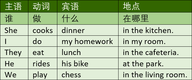 英语是先说“谁做什么”,再说“在哪里”,把地点放在句尾。