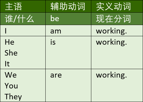 现在进行时态的结构是(以work为例):am doing; is doing; are doing