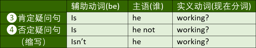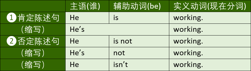 现在进行时的四种句子(以“He is working. / 他现在正在工作。”为例):