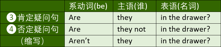 They aren’t in the drawer. /ðeɪ ɑrnt ɪn ðə drɔr/ 他们不在抽屉里。