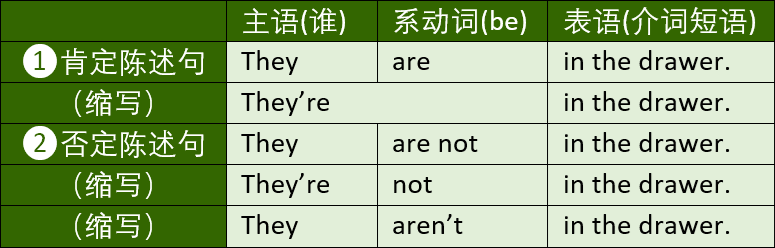 They are not in the drawer. /ðeɪ ər nɑt ɪn ðə drɔr/ 他们不在抽屉里。