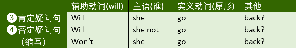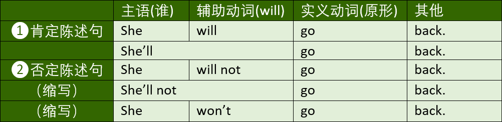 情态 will + 原形动词的四种句子(以 She will go back 为例):