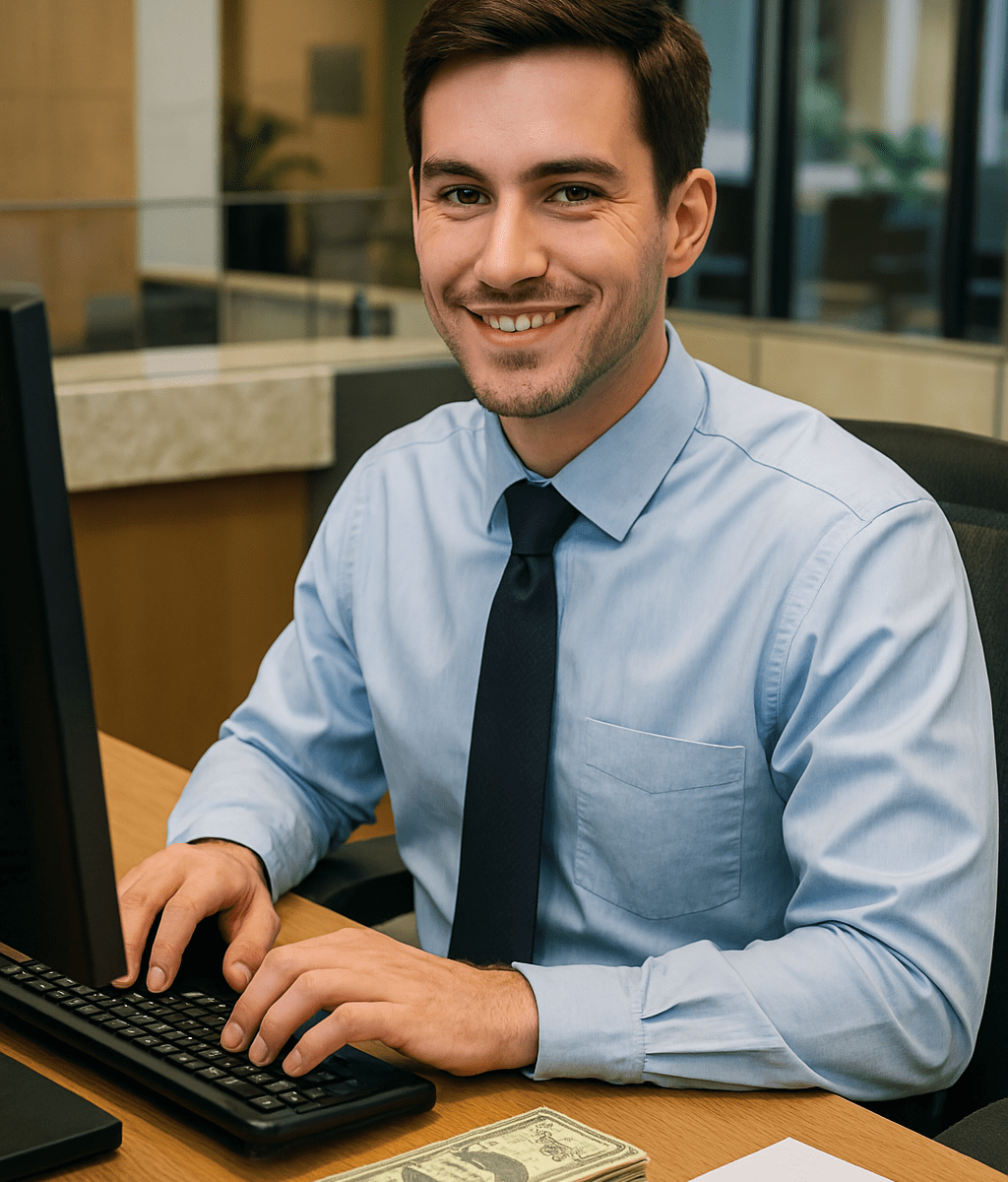 /aɪ wərk ət̬ ə bæŋk | aɪm ə klərk/