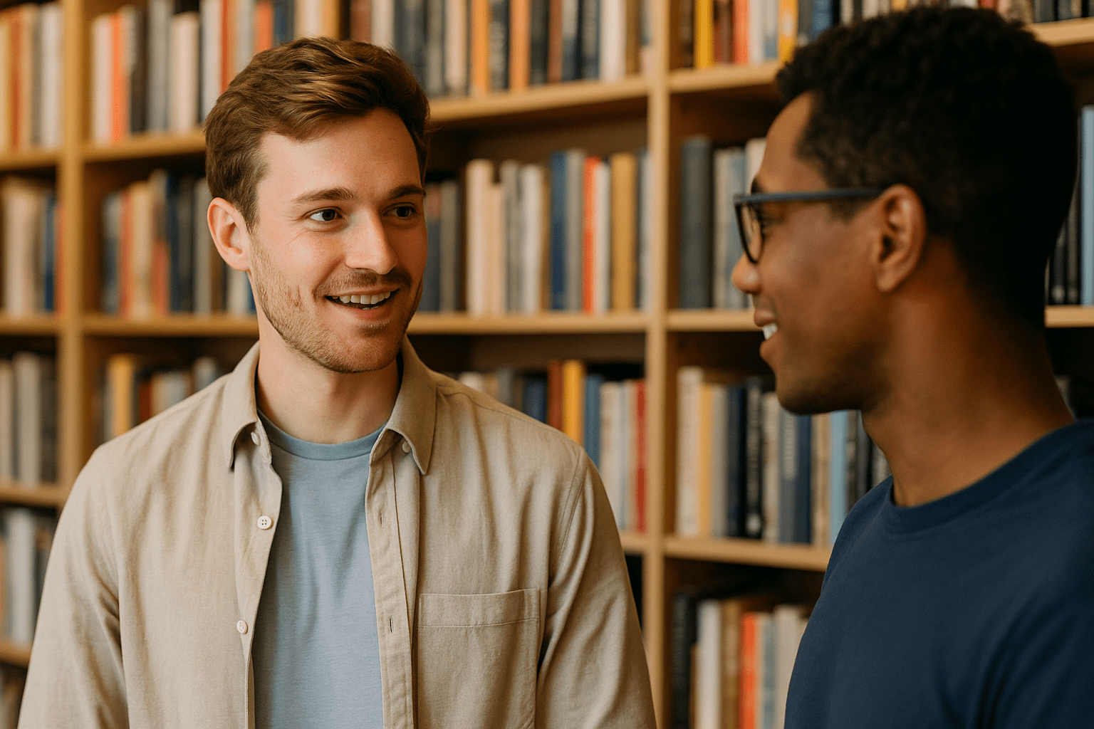 Scene: Two people meet for the first time and start a casual conversation. They introduce themselves and talk about their jobs and where they work.
