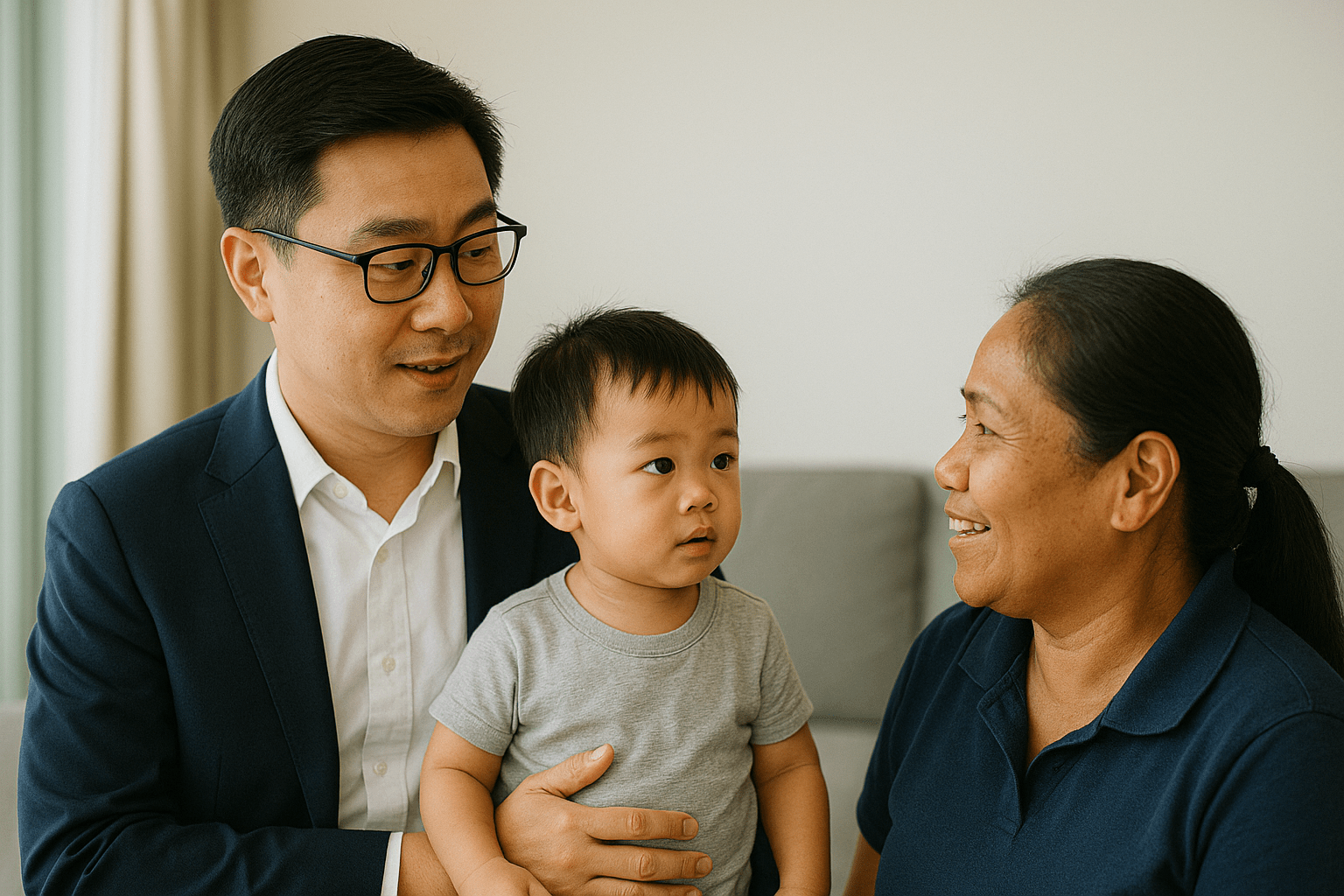 在工作了一整天之后,一位父亲回到家,与保姆聊聊他两岁的儿子詹姆斯今天的情况。