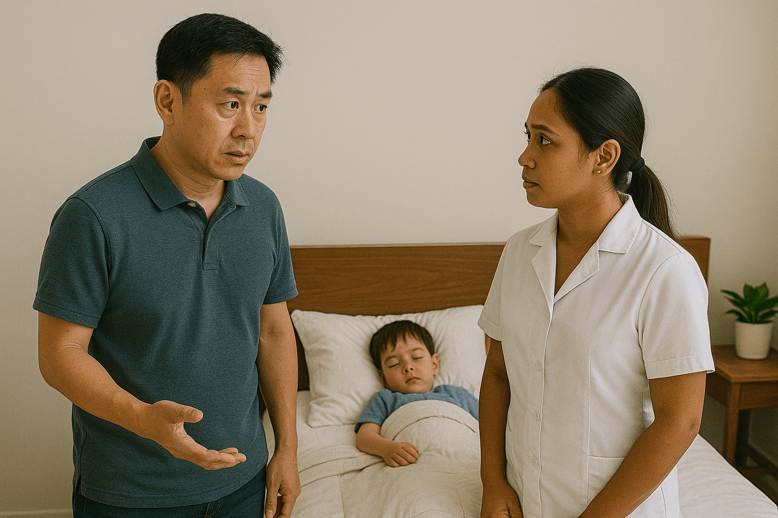 一位父亲正在和保姆谈论他今天身体不适的儿子 James。他们一起讨论症状以及接下来该怎么办。
