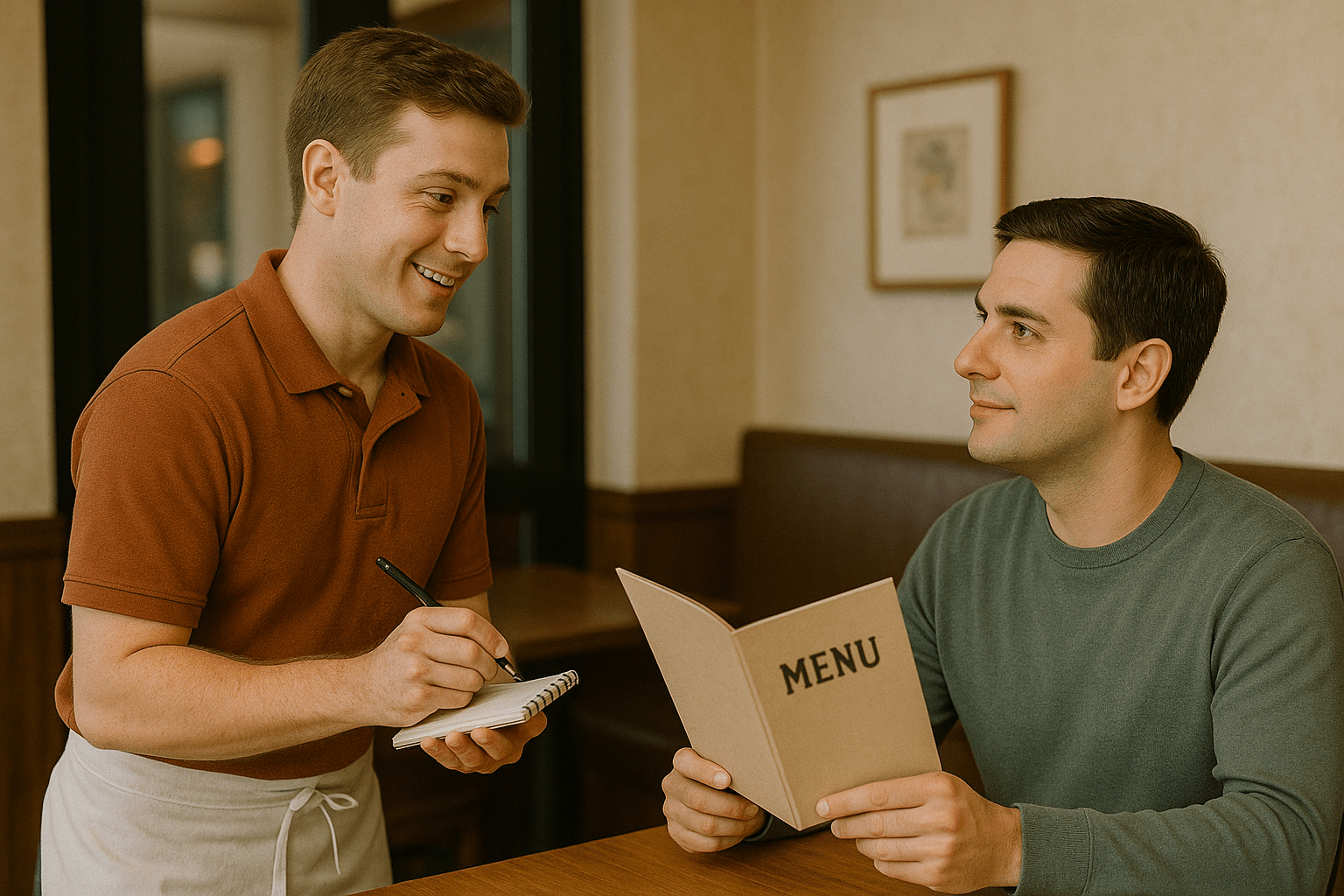 /ə ˈkʌstəmər wɔks ˈɪntu ə ˈkæʒuəl əˈmɛrɪkən ˈdaɪnər | ə ˈweɪtər ɡrits ɪm ən teɪks ɪz ˈɔrdər/