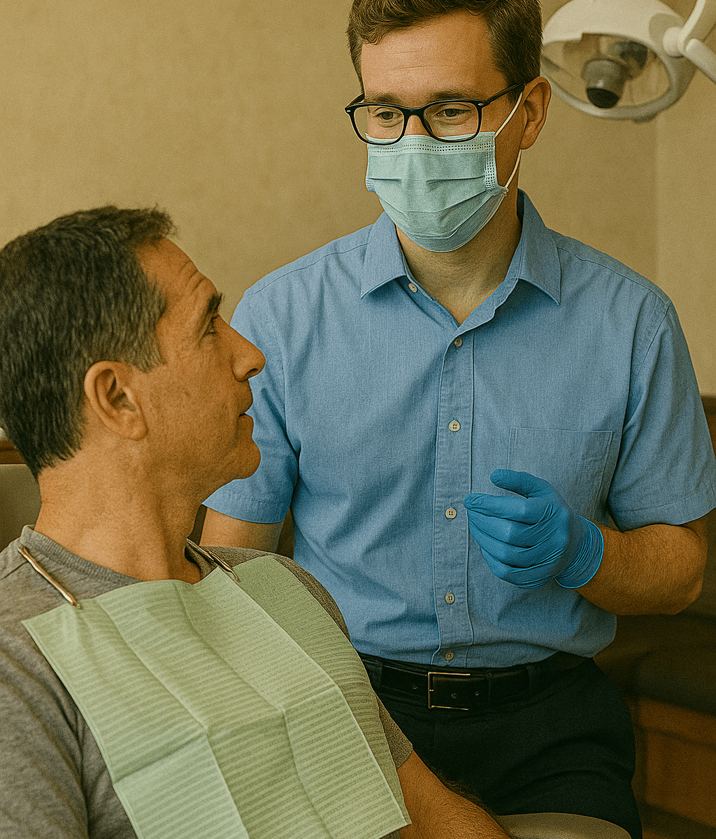 /ə ˈpeɪʃnt z ˈvɪzɪtɪŋ ðə ˈdɛn(t)ɪsts bəˈkəz əv ə ˈtuθˌeɪk | ðə ˈdɛn(t)ɪst ʧɛks ðə tuθ ən sɛz ə ˈfɪlɪŋ z ˈnidɪd/
