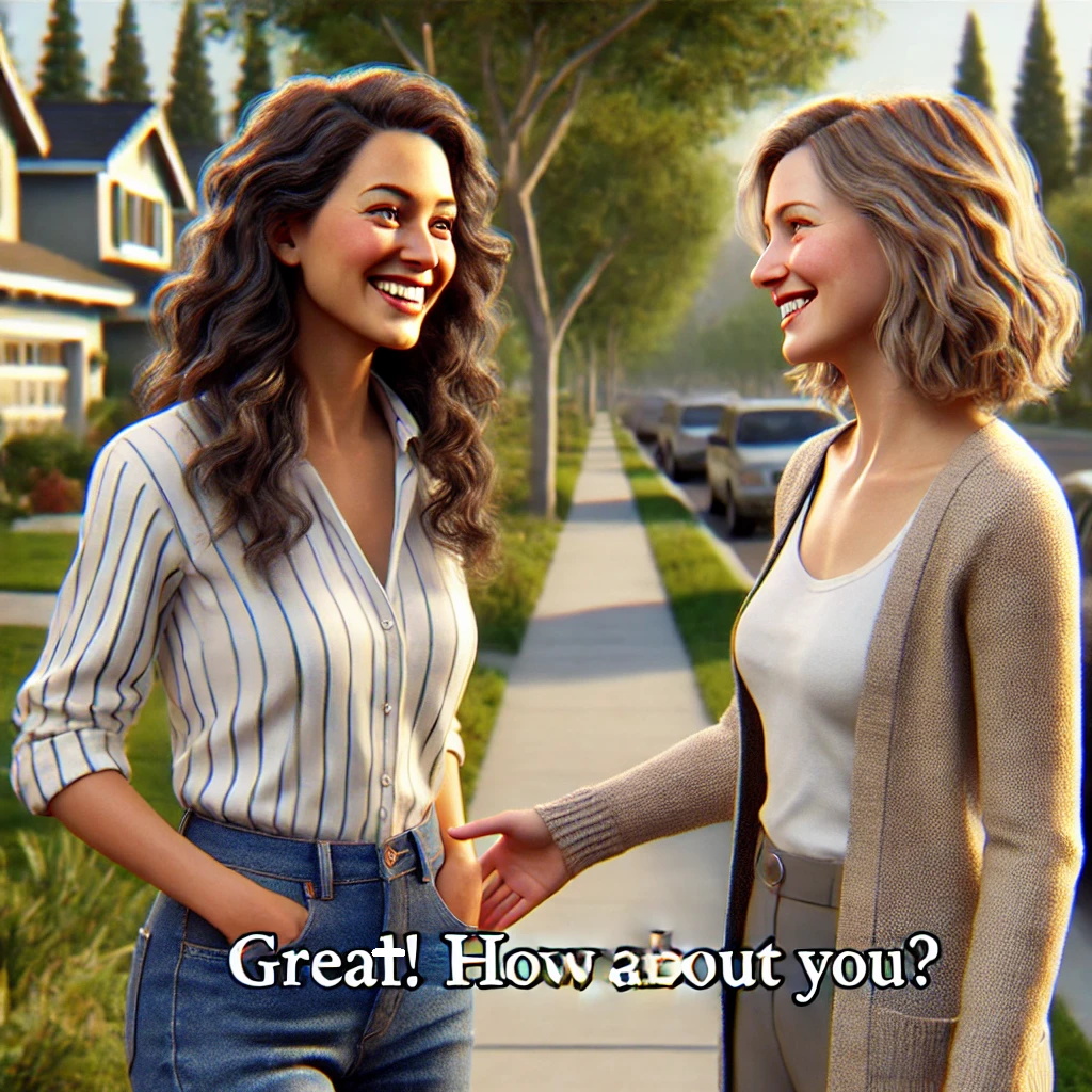 Great! How about you? /ɡreɪt haʊ əˈbaʊt ju/ 很好!你呢?