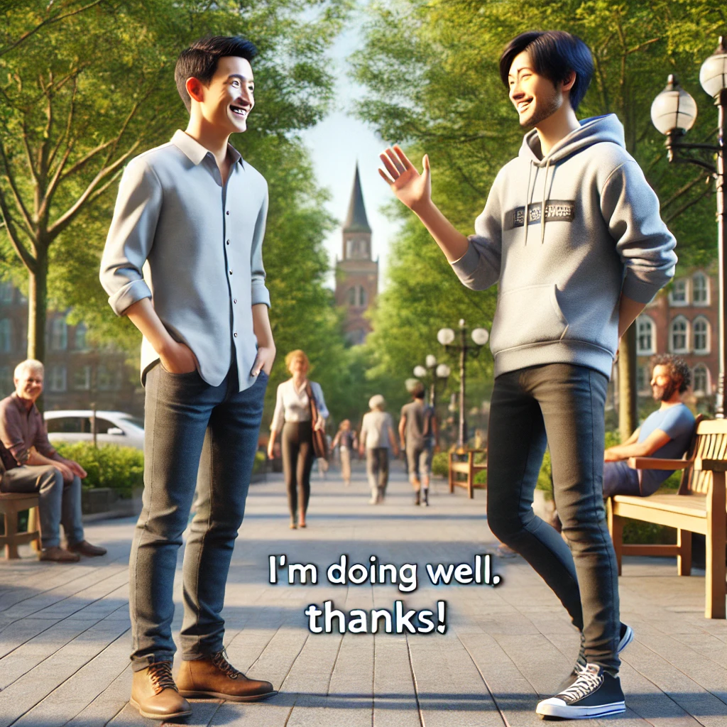 I’m doing well, thanks! /aɪm ˈduɪŋ wɛl θæŋks/ 我挺好的,谢谢!