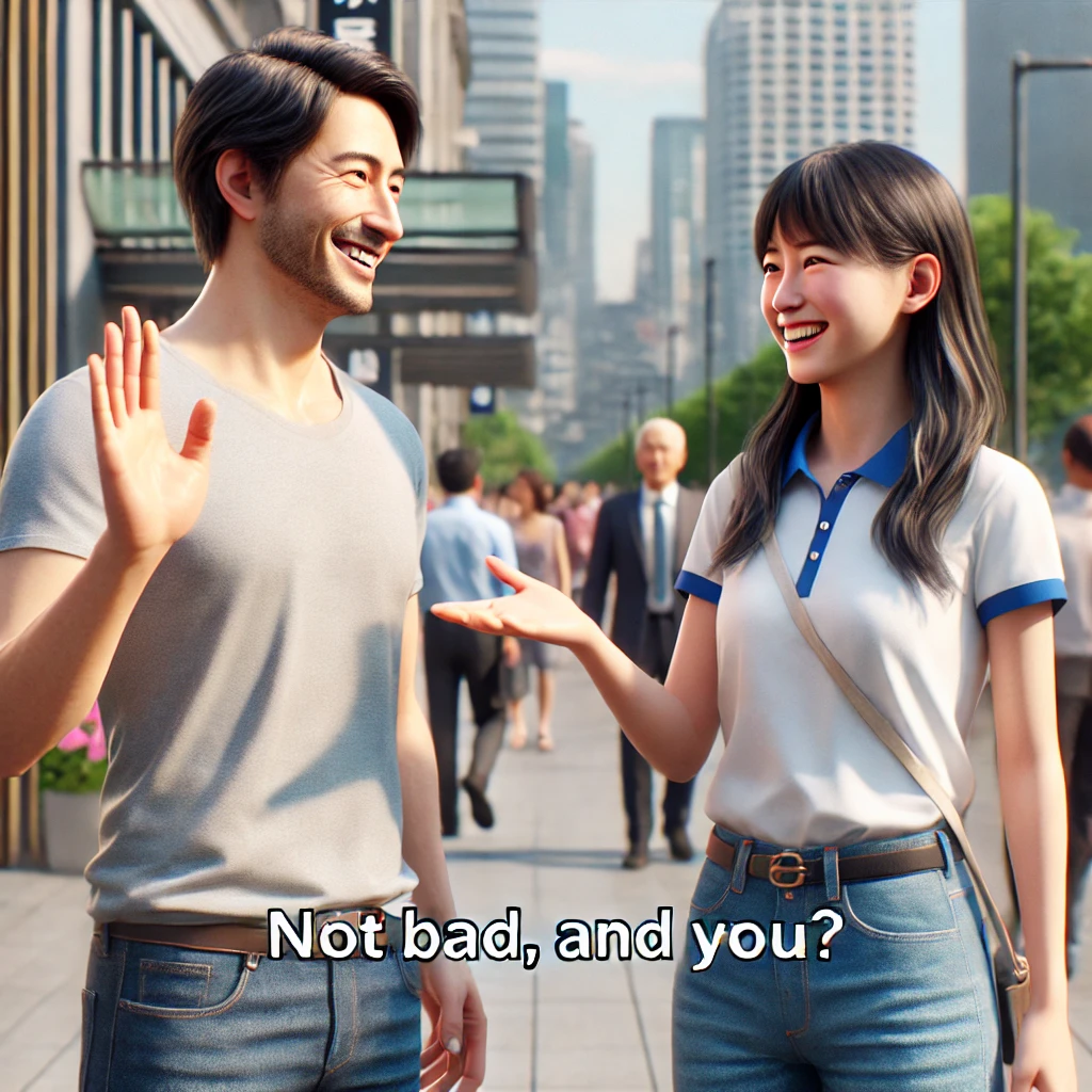 Not bad, and you? /nɑt bæd ənd ju/ 还不错,你呢?